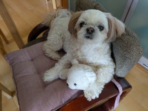 七ちゃんと相棒のぬいぐるみの八です。いつも八と戯れるのが七ちゃんのお氣に入りなのです!寝るときも八に枕するか、あご乗せに使用しています。または八を咥えて只管に振り回すのが得意というか大好きなのです!見ている僕まで笑顔になってきます。七ちゃん!八と一緒に家族みんなで元氣で楽しく一緒に暮らしていまあす。^^/