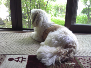 『ばあちゃ~ん』って庭に草むしりに出て行ったばあちゃんをひたすら待っている七ちゃん!お昼ごはんまでず~っとこのまんまでした。ばあちゃんが大好きなんです!おりこうさんにしていたら、ばあちゃんがご褒美をくれるのでず~っとこんな感じでいるのです!ばあちゃんが戻ってくるとクルクルと回転し、喜びを表現しているのを見てこちらまで優しい気持ちになり、眉が「八」の字になってま~す。^^/