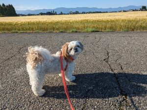 七ちゃんと朝の散歩に出かけて、黄色い麦畑と樹の緑と空の青が七ちゃんと僕に『どぉ~だぁ!キレイでしょ~!』と語りかけてくれています。風もなくてホント気持ちがいい朝なのです。6:30に撮ったもので、あと15分くらいで家に着く距離にいます。七ちゃんとふたりで「あ~ぁ気持ちいい~」と空気をいっぱい吸い込んで、そして爽やかさを目いっぱい感じるのでした。「さて、七ちゃん!帰ってごはん食べようね」^^