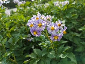 高岡市戸出吉住の「土・Ⅾo・居(つどい)farm」さんに教わった『無農薬無肥料栽培』の野菜たち!2年目の今年の発育は去年よりもやや遅れていると感じています。5月のゴールデンウイークに植え付けをしてから6月に入るまでは、根を張り伸びるまで、葉や茎の成長があまり感じられません。地上よりも地下での成長が著しいのです!根は栄養と水分を得る為にドンドン伸びていきます。栄養を吸収できるようになると地上の葉や茎を伸ばして成長していきます。去年は6月に入ると地上の成長を確認しましたが、去年より半月遅れての成長の確認となりました。初成りの摘果を経て一段と逞しく成長を進めています!早い時期からの高温も影響しているのかもしれません。梅雨に入り、天の恵みをいっぱあ~い蓄えて力強い野菜が出来てくるのだと僕は確信しています。写真はジャガイモの花です。