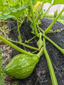我が家の『無農薬無肥料栽培』も根を確りと張ったようで、育ってきました。肥料の栄養もなく、野菜自身がドンドン根を張り、栄養と水分を求め吸収していきます。まるで我々人間にも当てはまる感じがしています。ナスも色濃く三本立に育ち、キュウリも何本か10㎝くらいに育ち、トマトもまだ青いのですが大きくなっています。カボチャもいくつか受粉させて握りこぶしくらいに育っています。小玉スイカも育ち、蔓を切っておきました。ツルムラサキも伸びてきて葉や茎を採って食べてみると、やはり美味しかったです。ピーマンやオクラ、そしてズッキーニたちも頑張って育ってくれています。味が濃く、香りも高くなる『無農薬無肥料栽培』って本当に凄いです!「土・Ⅾо・居farm」さん!ありがとうございます。(感謝)写真は、とても美味しいカボチャの「ロロン」さんです。^^/