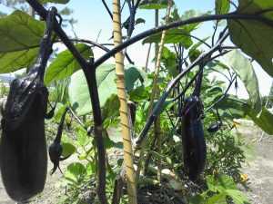 自家菜園で育つナスです。何度も収穫して、おいしく頂いています。ナスステーキに漬物、そして郷土料理である「よごし」は、とてもごはんがすすむ定番料理なのです。以前より、ナスは『肥料喰い』と呼ばれるだけあって「収穫の後には直ぐに肥料を与えなければ育たない」と思い込んでいました。去年までは『牛ふん』をたっぷりと与えていて、それが当たり前だと考えていました。無農薬は当然ですが、無肥料で栽培されている方が当院に来院されて以来!今までの考えが一変してしまいました!!写真のナスがその全てを物語っています。竹に銅線を巻いて挿してあります。マリーゴールドと大豆が混植してあります。菜園の草むしりをして集めた草を株の回りにのせて「草マルチ」にしてあります。水やりは天にお任せしています。でも唯一!お米のとぎ汁は毎日出ますから、野菜ごとに今日はキュウリに明日はナス、明後日はツルムラサキに、そして次はピーマンにと日替わりに与えています。野菜たちの顔を見るたびに「おっ!今日はまた一段と大きくなったよね!立派立派!」などと声かけをして触れるようにしています。このナスには「明日に収穫しようと思うんだ」と話しかけたところなのです。やはり、天の力(恵み)を頂いた野菜たちを食して「医食同源・薬食同源・免疫力アップ!」ですね。^^/