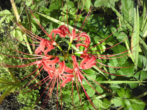 彼岸花を真上から撮ってみました。たくさん群生している彼岸花は何とも言えない赤い美しさを感じます。ひとつの彼岸花を上から見ると、また違ったものに見えてきます。この花の別名でよく聞くのが『曼珠沙華』ではないかと思いますが、何と!1000もの別名を持っているのだとか!?赤色の彼岸花の花言葉は『情熱・独立・再会・諦め・悲しい思い出・想うは貴方ひとり・また会う日を楽しみに』です。彼岸花の花、茎、葉、そして球根のすべてに毒を含んでいますので注意が必要ですが、見て美しさを愛でるだけであれば、こころが和みます。我が家の菜園の端っこに球根を植えてネズミやモグラ対策に一役買ってもらっています。