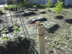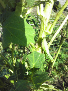 菜園にオクラを収穫したくて近づくと、何かユラユラしている枝のような!?いや、枝になり切っているカマキリ君を発見しました。もっと近づいて覗き込みますと今度は威嚇してきました。『自分が一番強いんだ』とばかりに大きな目を僕に向け、鎌の両手をしっかりと閉じて、飛びかかるその一瞬を狙っているかのようです。NHKBSで大きなカマキリが鳥を狙って、そして跳びかかり狩りをしているのです!小さな昆虫だけではないという事を知り、大変に驚いたものです!我が家の完全無農薬菜園には、本当にたくさんの生きものが住みついています。もちろん!他からもやってきていますので、見ているだけでも楽しいものです。野菜づくりだけではなく、生きもの観察もできる菜園っていいですよ。ご一緒しませんか!?^^