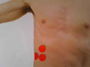 先ず!ピリピリ感の度合いを確認します。その側の胸壁(肋骨の下の部分)写真の赤い点で示されている場所をおもむろにつまみます。つまんでは放すを1・2・3程度繰り返して終了です。さあ!脚のピリピリ感は如何でしょう?雲散霧消していたらOKです。もう少し残っているようであれば繰り返し行なってください。