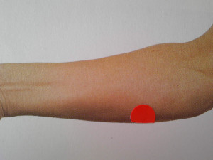 昨日は、両腕か、片腕だけでも上げて浅い呼吸から始める方法をお伝えしました。両手を頭の上で組んだり、行いやすい方法でお願い致します。(つけ加え)では今回!その重要点をお伝えしたいと思います。右前腕尺側上1/3部に赤い点が示されています!これは左右ともに行なう方法で、小指側のこの部分をやや強めの刺激を加えてください。この小指側の手首から肘関節の部は「心臓」の部に対応していて、赤い点を刺激することによって胸の痛みや動悸、そして過呼吸などに効果があります。赤い重要点が分からなければ小指側を手から肘まで刺激してください!それでも十分に効果はあると思います。この方法は個人やご家族で行なうことも可能ですが、救急関係者の方にも行なってほしいと僭越ながら思っています。