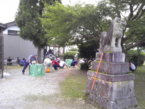 神社の掃除のあとすぐに一斉草刈りをお願いしました。総出で行なう草刈りと石拾い、ビオトープの掃除をみなさんに頑張って頂きました。出欠の確認とお茶配り、混合油の給油を行なって終了しました。