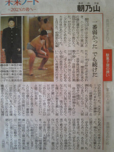 「おはようございます」朝9:00に今日最初の患者さんが来院されたときに一枚の新聞の切り込みを手渡されました。「朝乃山関は中学生の頃から行きつけの店があったんすよ~」と続きます。さすがにただ者ではない朝乃山関!手渡されたのは2020年9月6日(日)発行の朝日新聞13スポーツ「未来ノート」‐202xの君へ‐大相撲 朝乃山 呉羽に生まれて 駄菓子屋の誘い 富山の人間山脈 恩師たちのため とあります。読み進めていくと何故か涙が出てきました。Оさん!朝乃山関の切り込み本当にありがとうございました。以下、転載させて頂きます。