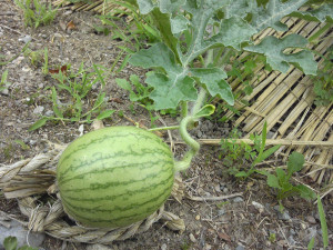 完全無農薬菜園の小玉スイカです。縄で座布団をつくり、そっとのせてあげました。菜園の野菜たちもこの暑さに負けず大きくなってくれていますので、僕も張り切って早朝から、一株に4リットルの水をあげています。たくさんある株すべてに4リットルをあげるので時間がかかりますが、元気に立派に育ってくれることに喜びを感じています。この小玉スイカは7月20日頃に収穫を予定しています。楽しみなのですが、おそらく七ちゃんにほとんど食べられちゃいそうで~す。