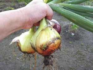 完全無農薬菜園で採れたタマネギ君です。雨が続きましたので水分をたくさん吸収していて、ずっしり感があります。白タマネギは、薄くスライスして味噌と合わせます。赤タマネギは味噌ではなく、塩と合わせてサラダ感覚で頂きます。カレーや煮物に何でも美味しくしてくれる万能野菜!そうめんのつゆにも最適で出汁と甘みがが一役も二役もかってくれます。「最近よく眠れない」「寝つきがわるい」とお困りの方には、スライスしたタマネギ君を数枚小皿にのせて、寝室に置いて頂きますと、硫化アリルとグルコキニンの香りが、心地よく睡眠を誘います。タマネギ君の効果効能は、たあ~っくさんあって血液をサラサラにするように「動脈硬化・心筋梗塞・脳卒中」また「高脂血症・高血圧・糖尿病の血糖値改善」それに「殺菌作用・解毒作用・抗炎症作用・抗酸化作用」他にも「肝機能強化・気管支喘息発作・骨粗鬆症・視力回復・老化防止」まだまだありますが、本当に凄いタマネギ君なのです!!『タマネギ君!これからもよろしくお願いします。感謝です!』^^/