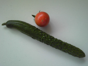 「おは~ぁつ」今朝に収穫したキュウリ君とトマトさんです。何故か、可愛くひとつだけっていうのも面白いですね。あとに控えているは、たくさんの人差し指くらいのキュウリ君や青いままのトマトさんの面々です。キュウリ君にはカリウムが多く含まれていて、むくみ解消に大活躍してくれますので大いに頂きたいものです。キュウリ君やトマトさん!そしてナスさんたち夏野菜は、この暑い時期には大切で、我々の体温を1℃下げてくれる優れものなのです。ドンドンとり入れていきたいと思います。夏野菜たちは冬にはあまり頂かない方が賢明で~す。^^/