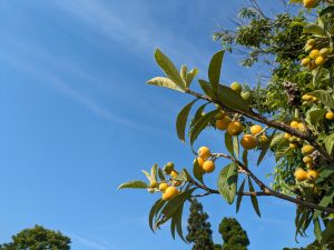 七ちゃんと朝の散歩の途中に見つけた枇杷(びわ)の実です。黄色く色づいています。この枇杷は大薬王樹ともいわれ、様々な効能を持っています!一家にこの大薬王樹があるとすれば、病気やケガなどには直ぐに対応ができてしまうかもしれません。枇杷のすべてを知れば、その木を育ててみたいと思われるかもしれません。僕もそのひとりです。^^