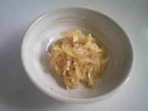 タマネギの皮を取り半分に切り、薹も一緒にスライスしていきます。油揚げを細かく切ってフライパンにスライスしたタマネギと一緒に炒めます。タマネギが透き通って柔らかくなりましたら、味噌を適量入れて3分ほど炒めて出来上がりです。