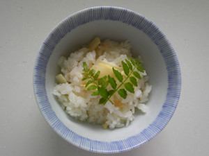 山椒の葉をのせて香りも楽しみます。おいしくて、ついついおかわりの回数を重ねてしまいました。炊き込みごはんっておいしいですよねぇ!僕は大好きで、たけのこはもちろん!きのこや山菜、しょうがなどで楽しんでいます。
