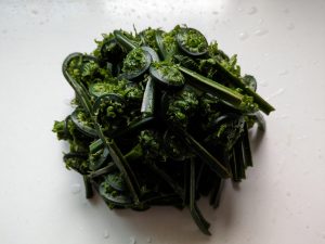 世界遺産五箇山で採れた「こごみ」です。新鮮な「こごみ」をどう楽しもうかと相談して『昆布〆』に決定しました。沸騰したお湯に「お塩」を適宜投入して「こごみ」を茹でていきます。2~3分茹でたら火を止め、冷水に浸して確りと水気を切り、昆布をキッチンペーパーにお酢を付けて拭き上げてから、昆布に「こごみ」をキレイに並べていきます。4段に分けて並び終えるとラップで包んで冷蔵庫で2.3日ほど保管してから頂きます。日数が経過すると昆布のぬめり感が出てきて美味しく頂けます。『富山県の昆布〆』は、とても美味しいので是非とも召し上がってくださいね。